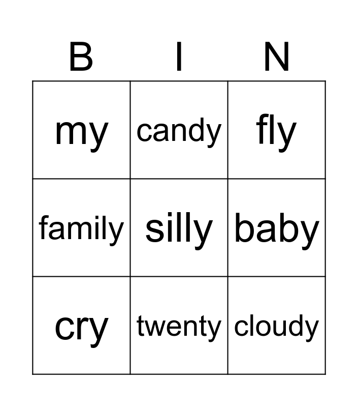 This bingo card has 9 words: cry, fly, candy, family, my, baby, silly, cloudy and twenty.