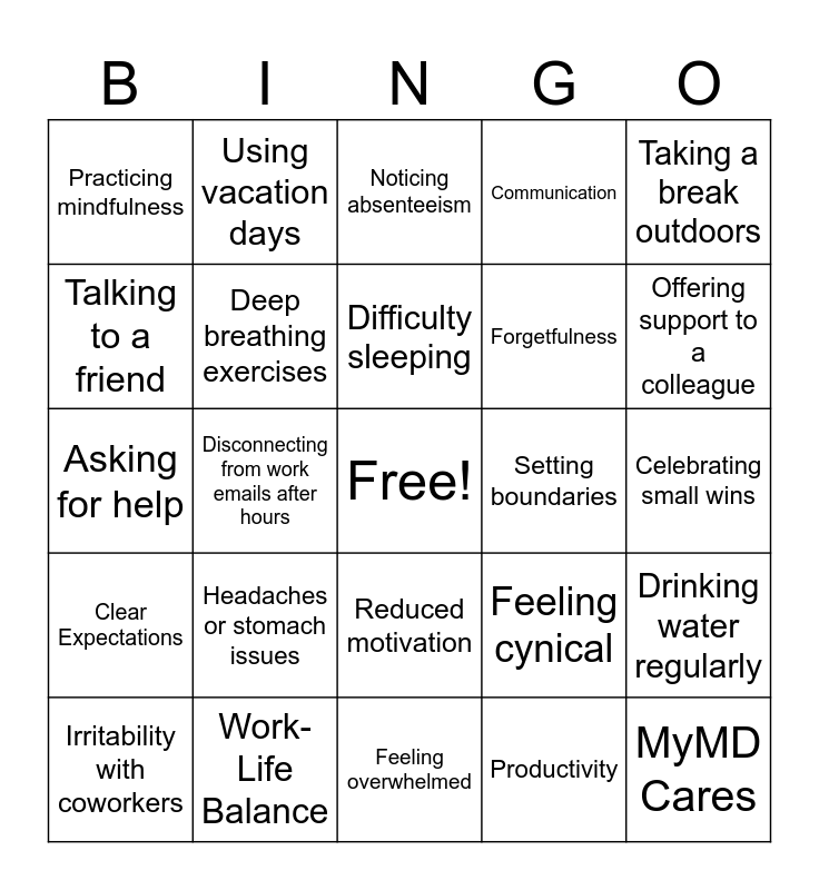 This bingo card has a free space and 25 words: Headaches or stomach issues, Feeling overwhelmed, Difficulty sleeping, Irritability with coworkers, Taking a break outdoors, Practicing mindfulness, Talking to a friend, Using vacation days, Setting boundaries, Reduced motivation, Forgetfulness, Asking for help, Feeling cynical, Drinking water regularly, Deep breathing exercises, Delegating tasks, Celebrating small wins, Noticing absenteeism, Offering support to a colleague, Disconnecting from work emails after hours, MyMD Cares, Work-Life Balance, Clear Expectations, Communication and Productivity.