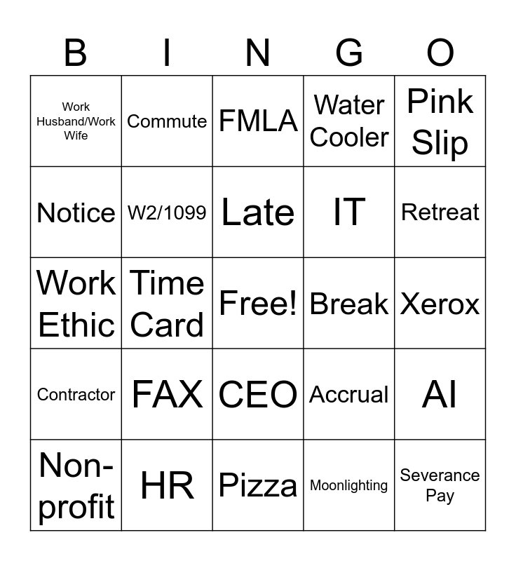 This bingo card has a free space and 40 words: Resume, Work Ethic, Lay off, W2/1099, HR, CEO, Late, PTO, Pink Slip, Contractor, Time Card, Water Cooler, Severance Pay, Xerox, Break, FAX, Work/ Life Balance, Work Husband/Work Wife, OSHA, FMLA, AI, Moonlighting, IT, Notice, PIP, Workers' Compensation, Union, "Remote", Job Share, Uniform, Pay check, Non-profit, Marketing, Accrual, Retreat, Pizza, Vocation, Graveyard Shift, Commute and Internship.
