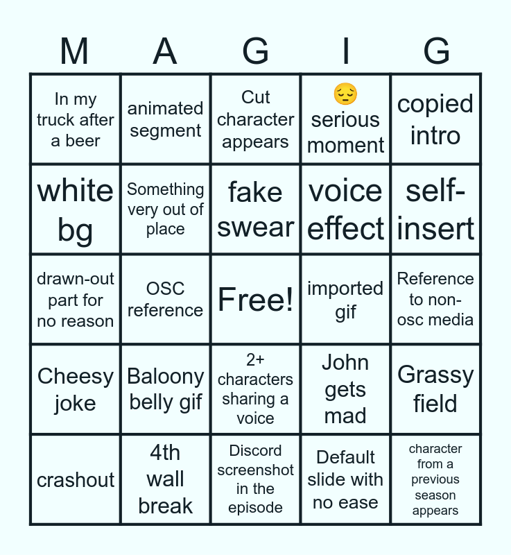 This bingo card has a free space and 24 words: Baloony belly gif, 4th wall break, fake swear, crashout, copied intro, In my truck after a beer, white bg, animated segment, imported gif, 2+ characters sharing a voice, voice effect, drawn-out part for no reason, John gets mad, Grassy field, Something very out of place, Default slide with no ease, Reference to non-osc media, Cut character appears, self-insert, OSC reference, character from a previous season appears, Cheesy joke, 😔serious moment and Discord screenshot in the episode.