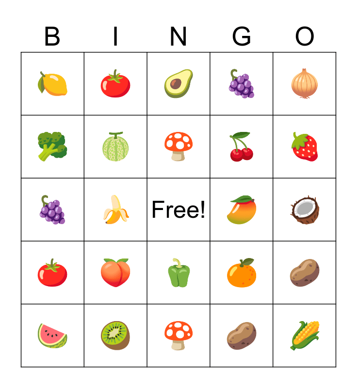 This bingo card has a free space and 29 words: 🍉, 🍎, 🍌, 🍍, 🍋, 🥑, 🍈, 🍑, 🥭, 🥝, 🥥, 🌽, 🍄, 🥔, 🍓, 🥒, 🫑, 🍅, 🧅, 🍇, 🍊, 🍆, 🍒, 🥦, 🍇, 🍅, 🥔, 🍄 and 🍓.
