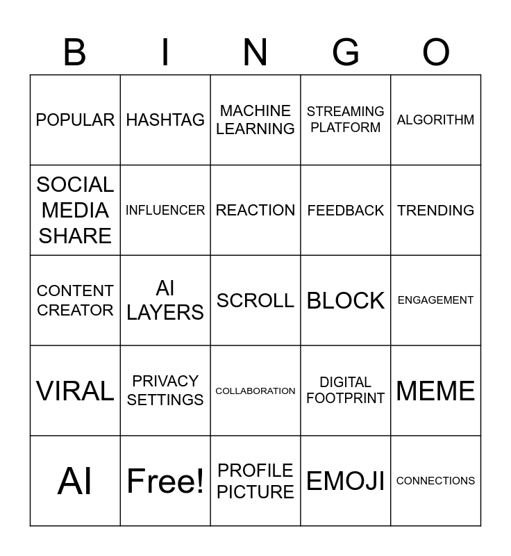 This bingo card has 28 words: MEME, SOCIAL MEDIA POST, FEEDBACK, EMOJI, SOCIAL MEDIA SHARE, MACHINE LEARNING, HASHTAG, VIRAL, BLOCK, AI, CONTENT CREATOR, STREAMING PLATFORM, Free!, PROFILE PICTURE, TRENDING, NOTIFICATION, PRIVACY SETTINGS, INFLUENCER, REACTION, COLLABORATION, POPULAR, CONNECTIONS, SCROLL, AI LAYERS, ENGAGEMENT, DIGITAL FOOTPRINT, ALGORITHM and SUBSCRIBERS.