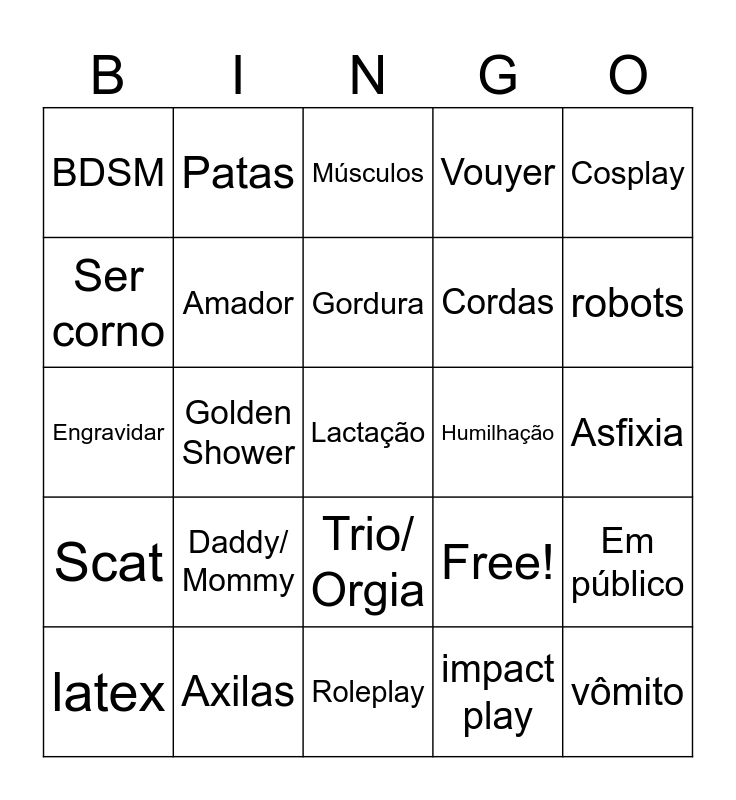 This bingo card has 25 words: Daddy/ Mommy, Roleplay, Gordura, latex, Cosplay, BDSM, Ser corno, Patas, Humilhação, Trio/ Orgia, Cordas, Engravidar, Free!, Em público, Amador, vômito, Asfixia, Músculos, robots, Golden Shower, Lactação, Axilas, Scat, Vouyer and impact play.