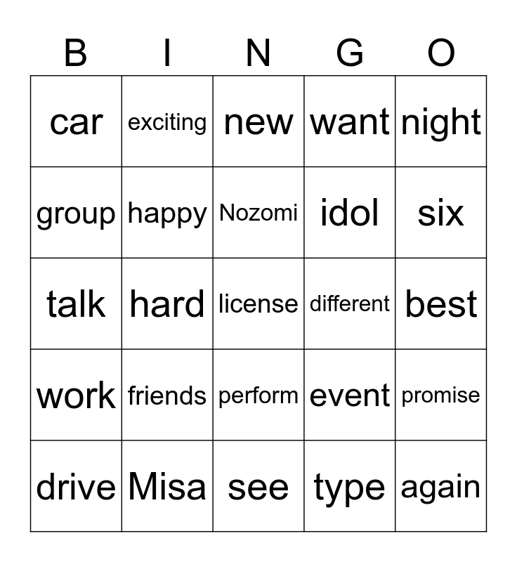 This bingo card has a free space and 24 words: friends, Misa, Nozomi, drive, night, car, group, exciting, different, perform, idol, talk, event, promise, happy, type, best, new, six, hard, again, work, want and see.