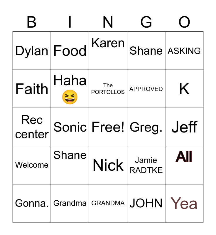 This bingo card has a free space and 24 words: Shane, Grandma, The PORTOLLOS, Gonna., ASKING, Dylan, Faith, Food, Greg., Nick, APPROVED, Rec center, Jamie RADTKE, All, Haha 😆, JOHN, Jeff, Karen, K, Sonic, Yea, Welcome, Shane and GRANDMA.