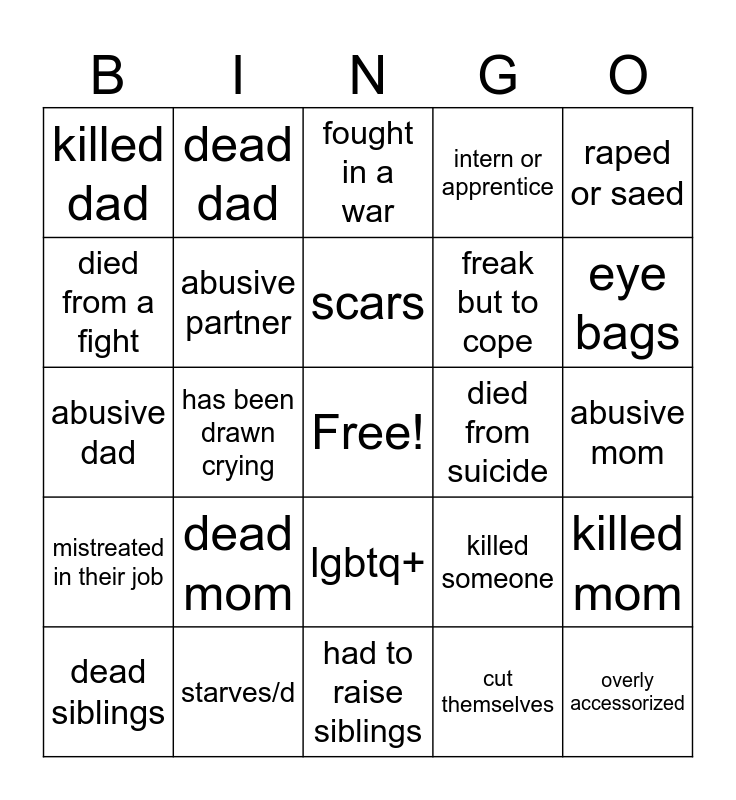 This bingo card has a free space and 24 words: dead mom, starves/d, scars, dead siblings, raped or saed, killed dad, died from a fight, dead dad, died from suicide, lgbtq+, freak but to cope, abusive dad, killed someone, killed mom, abusive partner, cut themselves, abusive mom, fought in a war, eye bags, has been drawn crying, overly accessorized, mistreated in their job, intern or apprentice and had to raise siblings.
