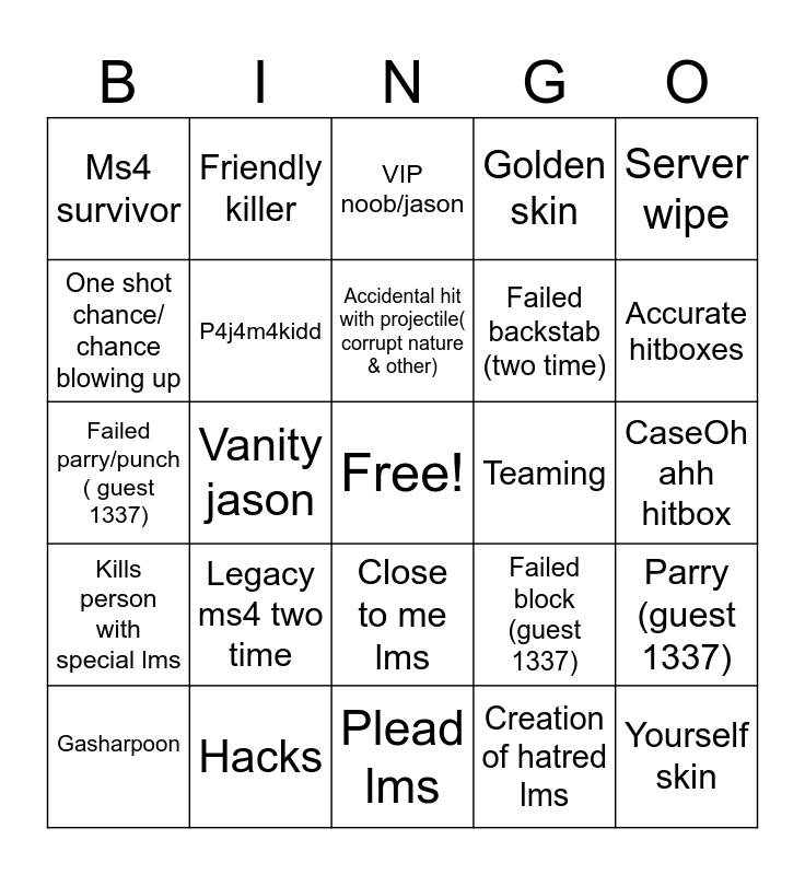 This bingo card has a free space and 29 words: Gasharpoon, Ragequit, Vanity jason, Ms4 killer, Ms4 survivor, VIP noob/jason, P4j4m4kidd, Legacy ms4 two time, Teaming, Hacks, CaseOh ahh hitbox, Yourself skin, Plead lms, Creation of hatred lms, Accurate hitboxes, Bald two time/ barber Jason, Close to me lms, Kills person with special lms, Server wipe, Failed parry/punch ( guest 1337), Failed block (guest 1337), Failed slash (Shedletsky), Failed backstab (two time), One shot chance/ chance blowing up, Golden skin, Friendly killer, Parry (guest 1337), Accidental hit with projectile( corrupt nature & other) and Annihilation John Doe.