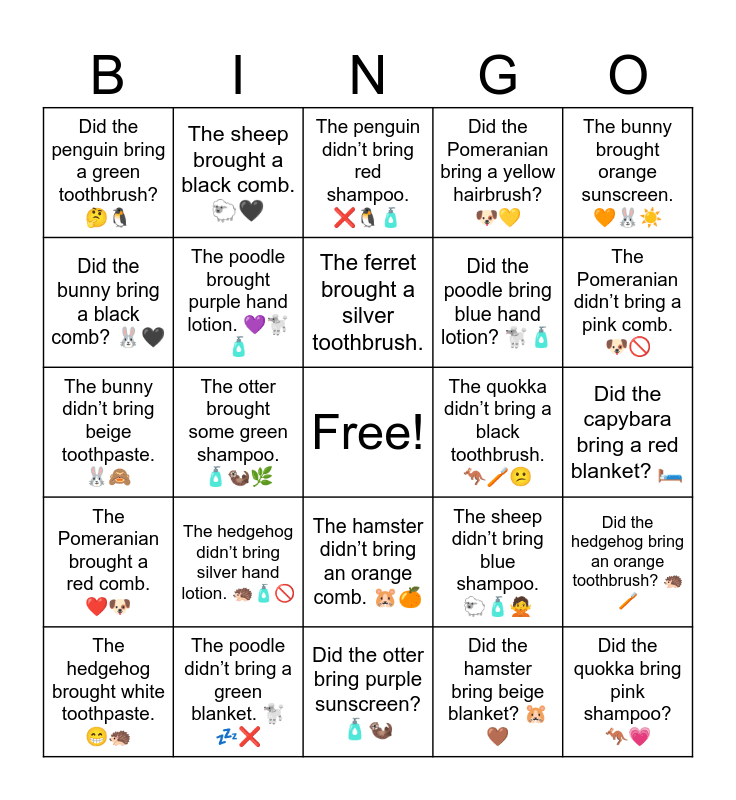 This bingo card has a free space and 33 words: The penguin brought a blue toothbrush., The capybara brought a pink blanket. ποΈπ©·π¦«, The otter brought some green shampoo. π§΄π¦¦πΏ, The quokka brought a yellow hairbrush. ππ¦, The Pomeranian brought a red comb. β€οΈπΆ, The poodle brought purple hand lotion. ππ©π§΄, The bunny brought orange sunscreen. π§‘π°βοΈ, The hedgehog brought white toothpaste. ππ¦, The sheep brought a black comb. ππ€, The hamster brought a beige blanket. πΉποΈ, The ferret brought a silver toothbrush., The penguin didnβt bring red shampoo. βπ§π§΄, The capybara didnβt bring a white hairbrush. π ββοΈ, The otter didnβt bring yellow sunscreen. π¦¦βοΈπ«, The quokka didnβt bring a black toothbrush. π¦πͺ₯π, The Pomeranian didnβt bring a pink comb. πΆπ«, The poodle didnβt bring a green blanket. π©π€β, The bunny didnβt bring beige toothpaste. π°π, The hedgehog didnβt bring silver hand lotion. π¦π§΄π«, The sheep didnβt bring blue shampoo. ππ§΄π , The hamster didnβt bring an orange comb. πΉπ, The ferret didnβt bring a purple toothbrush. πΎπͺ₯π, Did the penguin bring a green toothbrush? π€π§, Did the capybara bring a red blanket? ποΈ, Did the otter bring purple sunscreen? π§΄π¦¦, Did the quokka bring pink shampoo? π¦π, Did the Pomeranian bring a yellow hairbrush? πΆπ, Did the poodle bring blue hand lotion? π©π§΄, Did the bunny bring a black comb? π°π€, Did the hedgehog bring an orange toothbrush? π¦πͺ₯, Did the sheep bring white toothpaste? ππ¬, Did the hamster bring beige blanket? πΉπ€ and Did the ferret bring a silver hairbrush? πΎ.