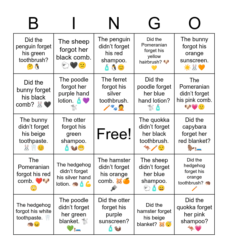 This bingo card has a free space and 33 words: The penguin forgot his blue toothbrush. ๐ชฅ๐ง๐ , The capybara forgot her pink blanket. ๐๏ธ๐ฆซ๐ด, The otter forgot his green shampoo. ๐งด๐ฆฆ๐ฌ, The quokka forgot her yellow hairbrush. ๐๐ฆ๐, The Pomeranian forgot his red comb. โค๏ธ๐ถ๐ณ, The poodle forgot her purple hand lotion. ๐งด๐๐ฉ, The bunny forgot his orange sunscreen. โ๏ธ๐ฐ๐งก, The hedgehog forgot his white toothpaste. ๐ฆท๐ฆ๐, The sheep forgot her black comb. ๐๐ค๐, The hamster forgot his beige blanket. ๐น๐๏ธ๐ด, The ferret forgot his silver toothbrush. ๐ชฅ๐พ๐คฆ, The penguin didnโt forget his red shampoo. ๐งด๐ง๐, The capybara didnโt forget her white hairbrush. ๐ฆซ๐ชฎ๐, The otter didnโt forget his yellow sunscreen. ๐ฆฆโ๏ธโ , The quokka didnโt forget her black toothbrush. ๐ฆ๐ชฅ๐, The Pomeranian didnโt forget his pink comb. ๐ถ๐๐, The poodle didnโt forget her green blanket. ๐ฉ๐๐๏ธ, The bunny didnโt forget his beige toothpaste. ๐ฐ๐ฆท๐, The hedgehog didnโt forget his silver hand lotion. ๐ฆ๐งด๐ช, The sheep didnโt forget her blue shampoo. ๐๐งด๐, The hamster didnโt forget his orange comb. ๐น๐๐ชฎ, The ferret didnโt forget his purple toothbrush. ๐พ๐ชฅ๐, Did the penguin forget his green toothbrush? ๐ค๐ง, Did the capybara forget her red blanket? ๐ฆซ๐๏ธ, Did the otter forget his purple sunscreen? ๐งด๐ฆฆ, Did the quokka forget her pink shampoo? ๐ฆ๐, Did the Pomeranian forget his yellow hairbrush? ๐ถ๐, Did the poodle forget her blue hand lotion? ๐ฉ๐งด, Did the bunny forget his black comb? ๐ฐ๐ค, Did the hedgehog forget his orange toothbrush? ๐ฆ๐ชฅ, Did the sheep forget her white toothpaste? ๐๐ฌ, Did the hamster forget his beige blanket? ๐น๐ด and Did the ferret forget his silver hairbrush? ๐พ๐ชฎ.