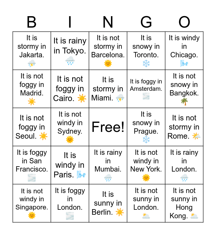 This bingo card has a free space and 34 words: It is sunny in Seoul. ☀️, It is not sunny in London. 🌥️, It is snowy in Moscow. ❄️, It is not snowy in Dubai. 🌵, It is foggy in San Francisco. 🌫️, It is not foggy in Cairo. ☀️, It is windy in Chicago. 🌬️, It is not windy in Singapore. 🌞, It is rainy in Tokyo. 🌧️, It is not rainy in Los Angeles. 🌤️, It is stormy in Miami. ⛈️, It is not stormy in Barcelona. 🌞, It is sunny in Sydney. ☀️, It is not sunny in Dublin. 🌥️, It is snowy in Prague. ❄️, It is not snowy in Bangkok. 🌴, It is foggy in London. 🌫️, It is not foggy in Seoul. ☀️, It is windy in Paris. 🌬️, It is not windy in New York. 🌞, It is rainy in Mumbai. 🌧️, It is not rainy in Cairo. ☀️, It is stormy in Jakarta. ⛈️, It is not stormy in Rome. 🌤️, It is sunny in Berlin. ☀️, It is not sunny in Hong Kong. 🌥️, It is snowy in Toronto. ❄️, It is not snowy in Los Angeles. 🌞, It is foggy in Amsterdam. 🌫️, It is not foggy in Madrid. ☀️, It is windy in Dublin. 🌬️, It is not windy in Sydney. 🌞, It is rainy in London. 🌧️ and It is not rainy in Dubai. ☀️.