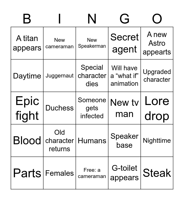 This bingo card has 25 words: Blood, Females, Someone gets infected, G-toilet appears, A new Astro appearts, A titan appears, New cameraman, New Speakerman, New tv man, Nighttime, Daytime, Juggernaut, Free: a cameraman, Speaker base, Upgraded character, Parts, Duchess, Special character dies, Will have a “what if” animation, Lore drop, Epic fight, Old character returns, Humans, Secret agent and Steak.