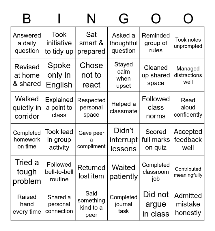 This bingo card has 36 words: Completed homework on time, Took lead in group activity, Said something kind to a peer, Stayed calm when upset, Followed class norms, Read aloud confidently, Answered a daily question, Shared a personal connection, Sat smart & prepared, Waited patiently, Cleaned up shared space, Took notes unprompted, Tried a tough problem, Explained a point to class, Chose not to react, Asked a thoughtful question, Completed classroom job, Accepted feedback well, Revised at home & shared, Spoke only in English, Gave peer a compliment, Didn’t interrupt lessons, Scored full marks on quiz, Contributed meaningfully, Walked quietly in corridor, Took initiative to tidy up, Respected personal space, Completed journal task, Reminded group of rules, Managed distractions well, Raised hand every time, Followed bell-to-bell routine, Returned lost item, Helped a classmate, Did not argue in class and Admitted mistake honestly.