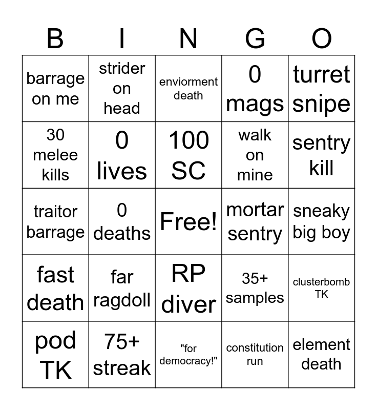 This bingo card has a free space and 24 words: far ragdoll, 75+ streak, 100 SC, pod TK, turret snipe, barrage on me, 30 melee kills, strider on head, mortar sentry, RP diver, walk on mine, traitor barrage, 35+ samples, clusterbomb TK, 0 lives, constitution run, sneaky big boy, enviorment death, sentry kill, 0 deaths, element death, fast death, 0 mags and "for democracy!".
