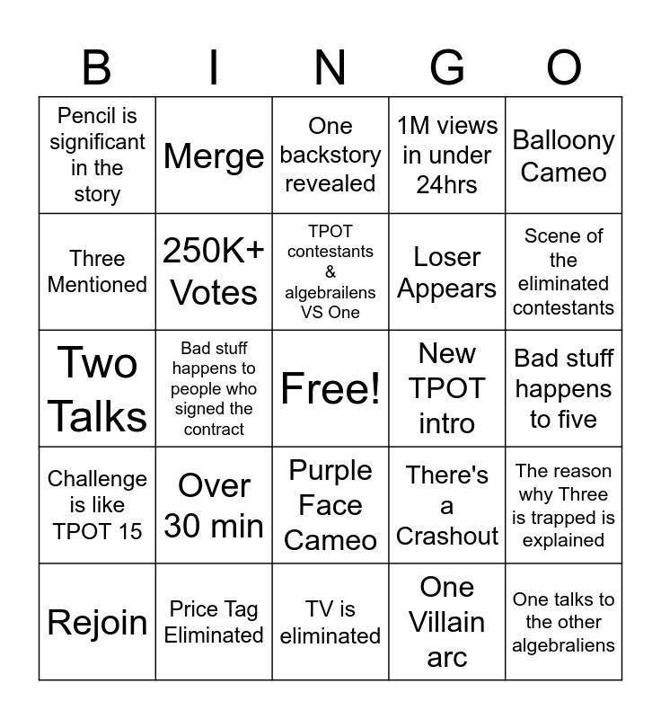 This bingo card has a free space and 24 words: Over 30 min, Price Tag Eliminated, TPOT contestants & algebrailens VS One, Rejoin, Balloony Cameo, Pencil is significant in the story, Three Mentioned, Merge, New TPOT intro, Purple Face Cameo, Loser Appears, Two Talks, There's a Crashout, The reason why Three is trapped is explained, 250K+ Votes, One Villain arc, Bad stuff happens to five, One backstory revealed, Scene of the eliminated contestants, Bad stuff happens to people who signed the contract, One talks to the other algebraliens, Challenge is like TPOT 15, 1M views in under 24hrs and TV is eliminated.