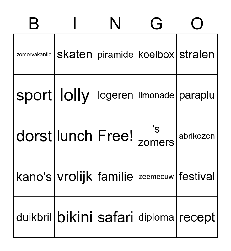 This bingo card has a free space and 26 words: familie, diploma, logeren, bikini, stralen, zomervakantie, sport, skaten, abrikozen, zeemeeuw, limonade, dorst, festival, duikbril, lunch, provincie, koelbox, kano's, piramide, recept, paraplu, safari, 's zomers, vrolijk, lolly and bagage.
