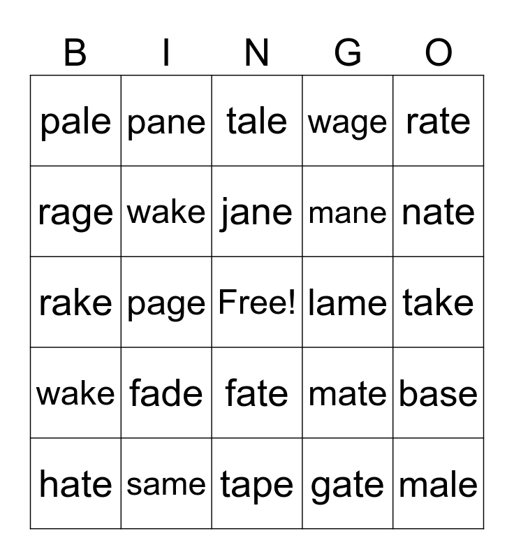 This bingo card has a free space and 30 words: same, make, page, tame, pale, tale, wake, fate, lame, tape, take, male, gate, fake, nate, date, mate, wake, fade, rate, rake, sale, pane, mane, rage, wage, base, hate, jane and tame.