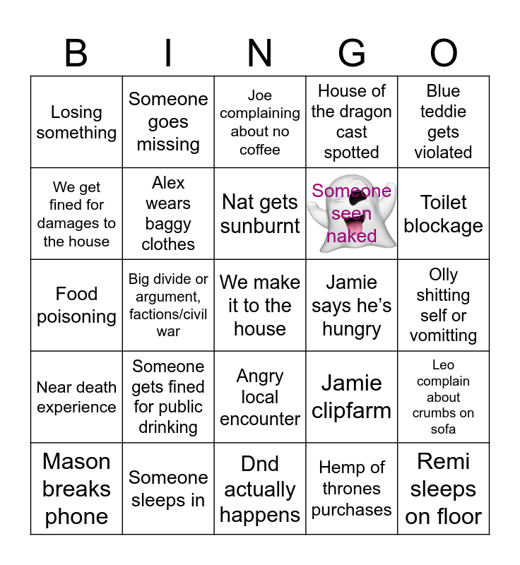 This bingo card has 1 images, a free space and 24 words: Mason breaks phone, Someone gets fined for public drinking, Nat gets sunburnt, Hemp of thrones purchases, Blue teddie gets violated, Losing something, Someone goes missing, Joe complaining about no coffee, Jamie says he’s hungry, Olly shitting self or vomitting, Food poisoning, Alex wears baggy clothes, Jamie clipfarm, Leo complain about crumbs on sofa, We get fined for damages to the house, Someone sleeps in, Dnd actually happens, House of the dragon cast spotted, Toilet blockage, Near death experience, Big divide or argument, factions/civil war, Angry local encounter, Someone seen naked and Remi sleeps on floor.