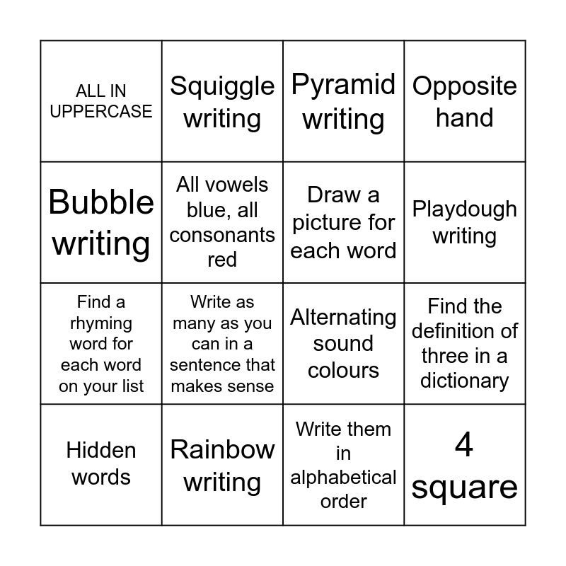 This bingo card has 16 words: Rainbow writing, Find the definition of three in a dictionary, Pyramid writing, ALL IN UPPERCASE, Find a rhyming word for each word on your list, Squiggle writing, Alternating sound colours, Write them in alphabetical order, Bubble writing, All vowels blue, all consonants red, Hidden words, Opposite hand, Write as many as you can in a sentence that makes sense, Playdough writing, Draw a picture for each word and 4 square.