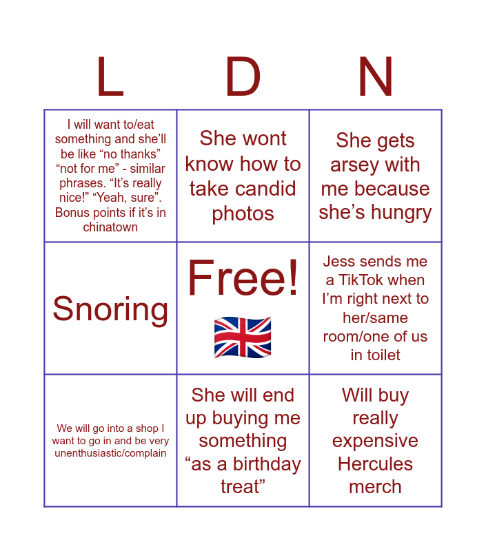 This bingo card has a free space and 8 words: Jess sends me a TikTok when I’m right next to her/same room/one of us in toilet, She gets arsey with me because she’s hungry, She wont know how to take candid photos, We will go into a shop I want to go in and be very unenthusiastic/complain, I will want to/eat something and she’ll be like “no thanks” “not for me” - similar phrases. “It’s really nice!” “Yeah, sure”. Bonus points if it’s in chinatown, Will buy really expensive Hercules merch, Snoring and She will end up buying me something “as a birthday treat”.