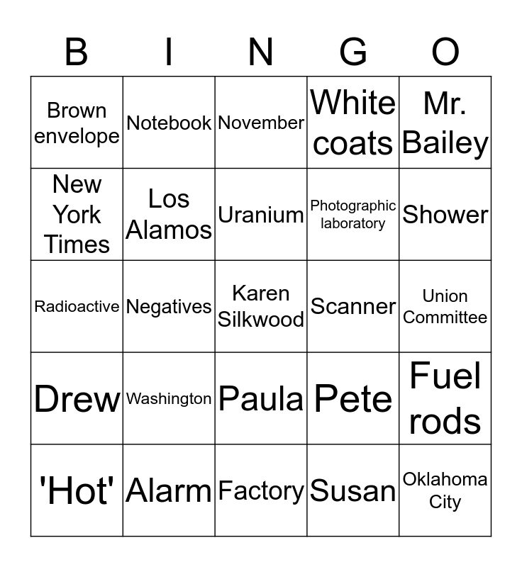 This bingo card has a free space and 24 words: Washington, Alarm, Uranium, 'Hot', Mr. Bailey, Brown envelope, New York Times, Notebook, Scanner, Paula, Photographic laboratory, Radioactive, Pete, Fuel rods, Los Alamos, Susan, Union Committee, November, Shower, Negatives, Oklahoma City, Drew, White coats and Factory.