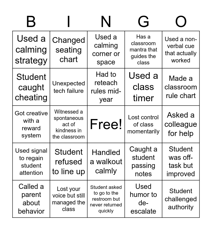 This bingo card has a free space and 24 words: Student refused to line up, Lost your voice but still managed the class, Had to reteach rules mid-year, Called a parent about behavior, Used a non-verbal cue that actually worked, Used a calming strategy, Student caught cheating, Changed seating chart, Lost control of class momentarily, Handled a walkout calmly, Used a class timer, Got creative with a reward system, Caught a student passing notes, Student was off-task but improved, Unexpected tech failure, Used humor to de-escalate, Asked a colleague for help, Used a calming corner or space, Made a classroom rule chart, Witnessed a spontaneous act of kindness in the classroom, Student challenged authority, Used signal to regain student attention, Has a classroom mantra that guides the class and Student asked to go to the restroom but never returned quickly.