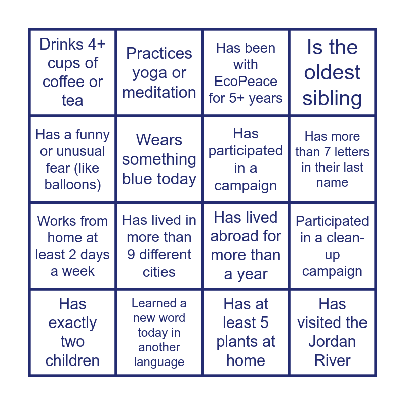 This bingo card has 16 words: Learned a new word today in another language, Participated in a clean-up campaign, Has been with EcoPeace for 5+ years, Drinks 4+ cups of coffee or tea, Works from home at least 2 days a week, Practices yoga or meditation, Has lived abroad for more than a year, Has at least 5 plants at home, Has a funny or unusual fear (like balloons), Wears something blue today, Has exactly two children, Is the oldest sibling, Has lived in more than 9 different cities, Has more than 7 letters in their last name, Has participated in a campaign and Has visited the Jordan River.