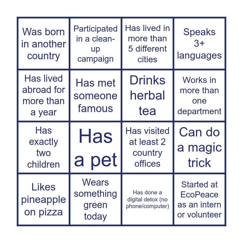 This bingo card has 16 words: Wears something green today, Can do a magic trick, Has lived in more than 5 different cities, Was born in another country, Has exactly two children, Participated in a clean-up campaign, Has visited at least 2 country offices, Has done a digital detox (no phone/computer), Has lived abroad for more than a year, Has met someone famous, Likes pineapple on pizza, Speaks 3+ languages, Has a pet, Works in more than one department, Drinks herbal tea and Started at EcoPeace as an intern or volunteer.