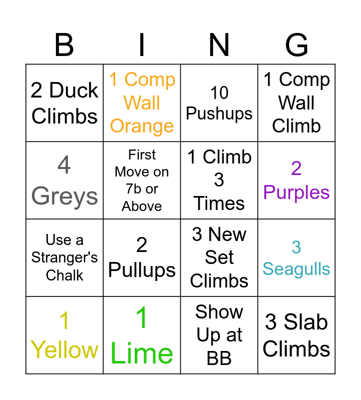 This bingo card has 16 words: 1 Lime, 3 Seagulls, 10 Pushups, 2 Duck Climbs, Use a Stranger's Chalk, 1 Comp Wall Orange, 3 New Set Climbs, Show Up at BB, 4 Greys, First Move on 7b or Above, 1 Yellow, 1 Comp Wall Climb, 2 Pullups, 2 Purples, 1 Climb 3 Times and 3 Slab Climbs.