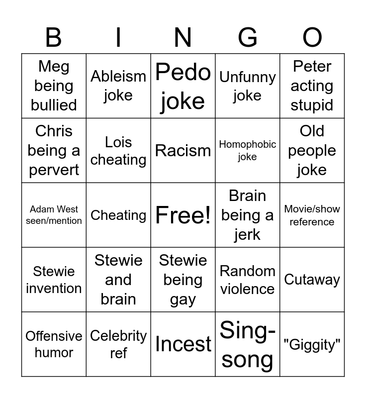 This bingo card has a free space and 24 words: Stewie and brain, Celebrity ref, Racism, Offensive humor, Peter acting stupid, Meg being bullied, Chris being a pervert, Ableism joke, Brain being a jerk, Stewie being gay, Homophobic joke, Adam West seen/mention, Random violence, Cutaway, Lois cheating, Sing-song, Movie/show reference, Pedo joke, Old people joke, Cheating, "Giggity", Stewie invention, Unfunny joke and Incest.