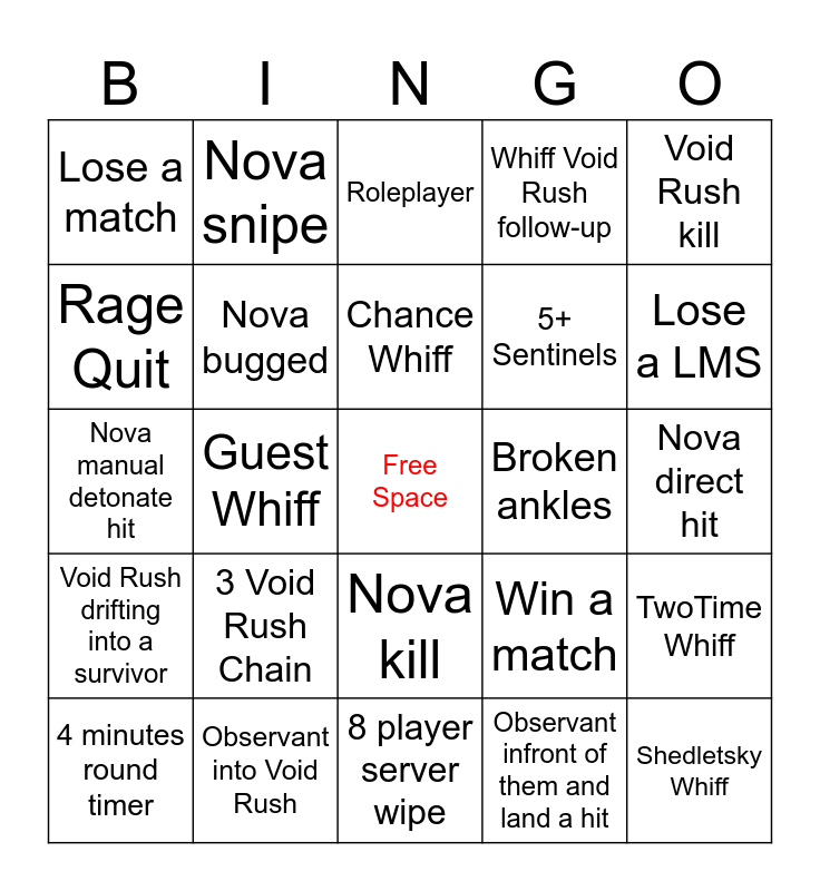 This bingo card has a free space and 27 words: Win a match, Anything hitting through walls except Nova, 5+ Sentinels, 8 player server wipe, Rage Quit, Roleplayer, Nova snipe, Void Rush drifting into a survivor, Broken ankles, TwoTime Whiff, Nova manual detonate hit, Whiff Void Rush follow-up, 4 minutes round timer, Observant into Void Rush, Lose a LMS, Nova actually pulls someone, Nova bugged, Chance Whiff, 3 Void Rush Chain, Lose a match, Nova direct hit, Observant infront of them and land a hit, Guest Whiff, Shedletsky Whiff, Nova kill, Void Rush kill and Nova hitting 2+ people.