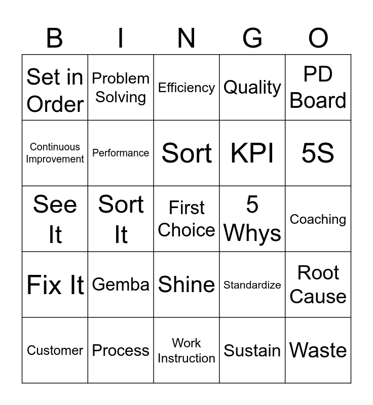 This bingo card has a free space and 24 words: Gemba, Process, Sort, Customer, PD Board, Set in Order, Continuous Improvement, Problem Solving, 5 Whys, Shine, KPI, See It, Standardize, Root Cause, Performance, Sustain, Coaching, Efficiency, 5S, Sort It, Waste, Fix It, Quality and Work Instruction.