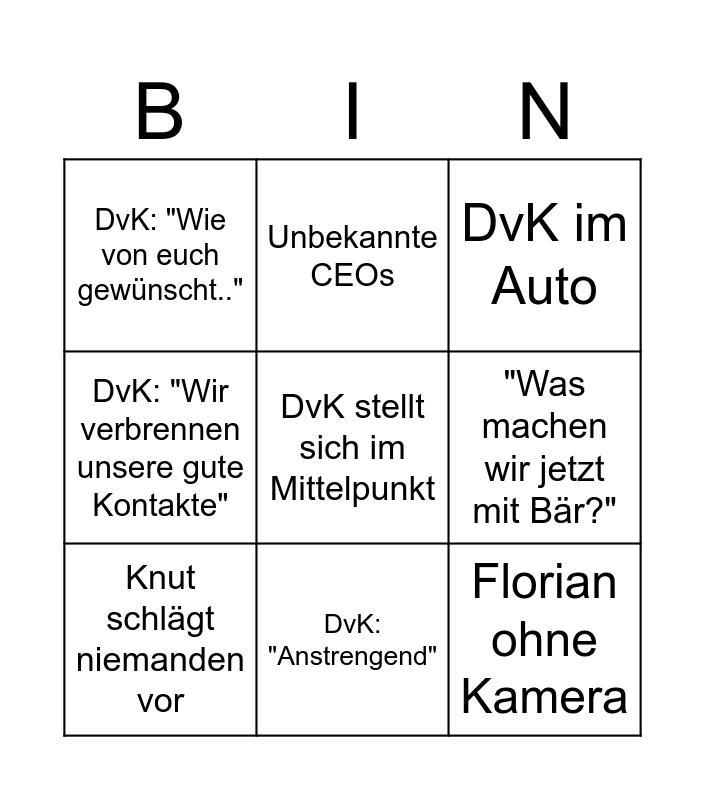 This bingo card has a free space and 8 words: "Was machen wir jetzt mit Bär?", DvK im Auto, Unbekannte CEOs, Knut schlägt niemanden vor, DvK: "Wie von euch gewünscht..", Florian ohne Kamera, DvK: "Wir verbrennen unsere gute Kontakte" and DvK: "Anstrengend".