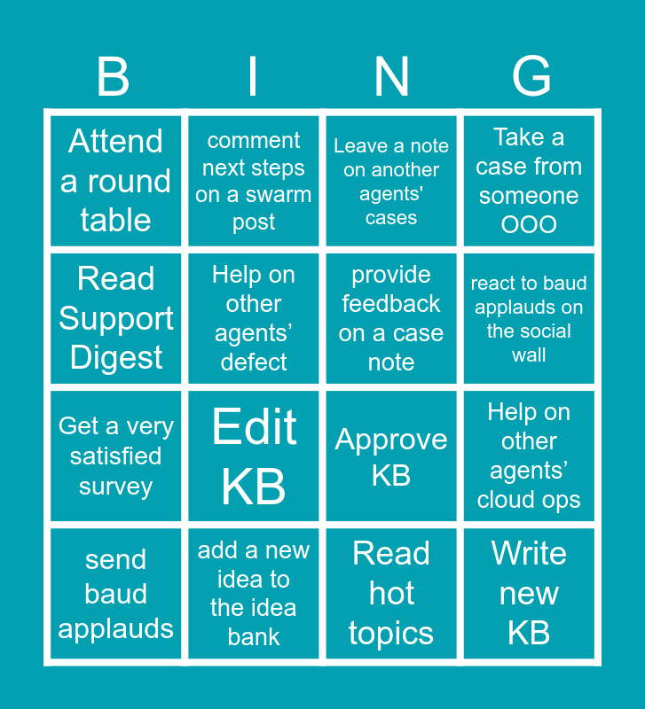 This bingo card has 18 words: Edit KB, Write new KB, Leave a note on another agents' cases, Attend a round table, Approve KB, Take a case from someone OOO, send baud applauds, comment next steps on a swarm post, react to baud applauds on the social wall, Get a very satisfied survey, Read hot topics, Read Support Digest, Help on other agents’ cloud ops, Help on other agents’ defect, provide feedback on a case note, receive Baud Applauds, add a new idea to the idea bank and vote on Idea bank idea.