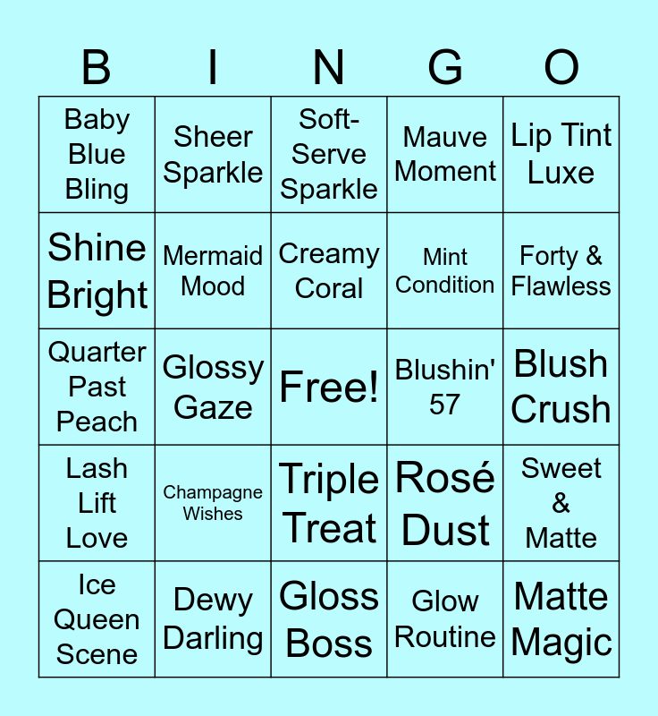 This bingo card has a free space and 90 words: Blush Begins, Two-Tone Gloss, Triple Treat, Fab Four Shadows, Powder Puff, Pink Pop, Lucky Lashes, Opal Glow, Lip Liner Love, Ten out of Ten (Skin!), Sugar Swirl, Pearl Dozen, Lilac Dreams, Blush Crush, Mani Magic, Creamy Coral, Seventeen Shades, Pastel Princess, Rosy Realness, Two-Zero Shimmer, Twenty-Won!, Minty Mood, Gloss Boss, Crystal Compact, Quarter Past Peach, Dewy Darling, Flirty Filter, Satin Swipe, Glow Getter, Pink Thirty, Vanilla Vibe, Sweet & Matte, Matcha Mousse, Lash Lift Love, Baby Blue Bling, Mauve Moment, Soft-Serve Sparkle, Candy Cloud, Glossy Gaze, Forty & Flawless, Ice Queen Scene, Shine Bright, Bubble Bath Bliss, Frosé All Day, Makeup Maven, Rosé Dust, Blingy Things, Nail Goals, Barely There, Half Glam, Sunset Smudge, Mint Condition, Gloss Over It, Pastel Please, Five-Five Fabulous, Lip Balm Queen, Blushin' 57, Shimmer Sheen, French Tip Fancy, Sixty Swatch, Makeup Mischief, Spa Day Soirée, Palette Perfect, Moonbeam Dust, Frosty Finish, Lipstick Fix, Pearly Pop, Glow Routine, Flirty Flick, Blusher Heaven, Champagne Wishes, Matte Magic, Kiss Me Coral, Ombre Allure, Sheer Sparkle, Mermaid Mood, Dainty Diva, Just Peachy, Fairy Dust, Glowy & Gorgeous, Powdered Pastels, Lip Tint Luxe, Feather Finish, Cool Tone Queen, Rosy Pearl, Dreamy Drape, Brow Goals, Pearly Queen, Cotton Candy Crush and Glam Finale.