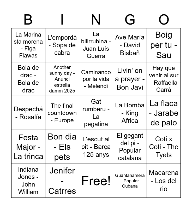 This bingo card has 31 words: Free!, Amigos para simepre - Los Manolos, Another sunny day - Anunci estrella damm 2025, Aserejé - Las quetchup, Ave María - David Bisbañ, Boig per tu - Sau, Bola de drac - Bola de drac, Bon dia - Els pets, Caminando por la vida - Melendi, Chica ye ye - Concha Velasco, Coti x Coti - The Tyets, Despechá - Rosalía, Devuélveme a mi chica - Hombres G, El chiringuito - Georgie Dann, El gegant del pi - Popular catalana, Eva María - Formula V, Festa Major - La trinca, The final countdown - Europe, Gat rumberu - La pegatina, Guantanamera - Popular Cubana, Hay que venir al sur - Raffaella Carrà, Indiana Jones - John William, Jenifer - Catrres, La bilirrubina - Juan Luís Guerra, La Bomba - King Africa, La flaca - Jarabe de palo, La Marina sta morena - Figa Flawas, L'empordà - Sopa de cabra, L'escut al pit - Barça 125 anys, Livin' on a prayer - Bon Javi and Macarena - Los del rio.