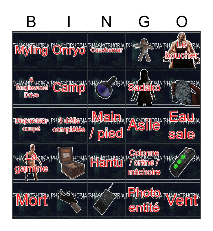 This bingo card has 99 images and 85 words: Esprit, Spectre, Fantôme, Cauchemar, Poltergeist, Banshee, Djinn, Revenant, Ombre, Démon, Yurei, Oni, Yokai, Hantu, Goryo, Myling, Onryo, Jumeaux, Raiju, Obake, Mimic, Moroi, Deogen, Thaye, Photo entité, Vidéo entité, PUB, 3 défis complétés, Disjoncteur coupé, Soleil levant, Temps clair, Brouillard, Apparition physique, Apparition spectrale, Apparition ombre, Lumière rouge, Ampoule cassé, Main / pied, Colonne / crâne / mâchoire, OS long, Cage thoracique / omoplate / bassin, Douche bain, Easter egg VIP, Mist, 0% de SM, Game sans encens, Game avec encens, Frère hache, Tonton hache, Monsieur faucille, Papi hache, Le boucher, Negan, Le tout nu, Tatie smiley, La gamine, Mamie faucille, Sadako, 6 Tanglewood Drive, 10 Ridgeview court, 13 Willo Street, 42 Edgefield Road, Camp, Grafton Farmhouse, Bleasdale Farmhouse, Point Hope, Asile, "Feur", "Su-per", Raid, Follow, Honteux, Listen, Apparition chantante, Eau sale, Mort, Blood moon, Pluie, Vent, Neige, Klaxon, Lumière allumée, Porte claquée, Enregistrement audio and Nell's Diner.
