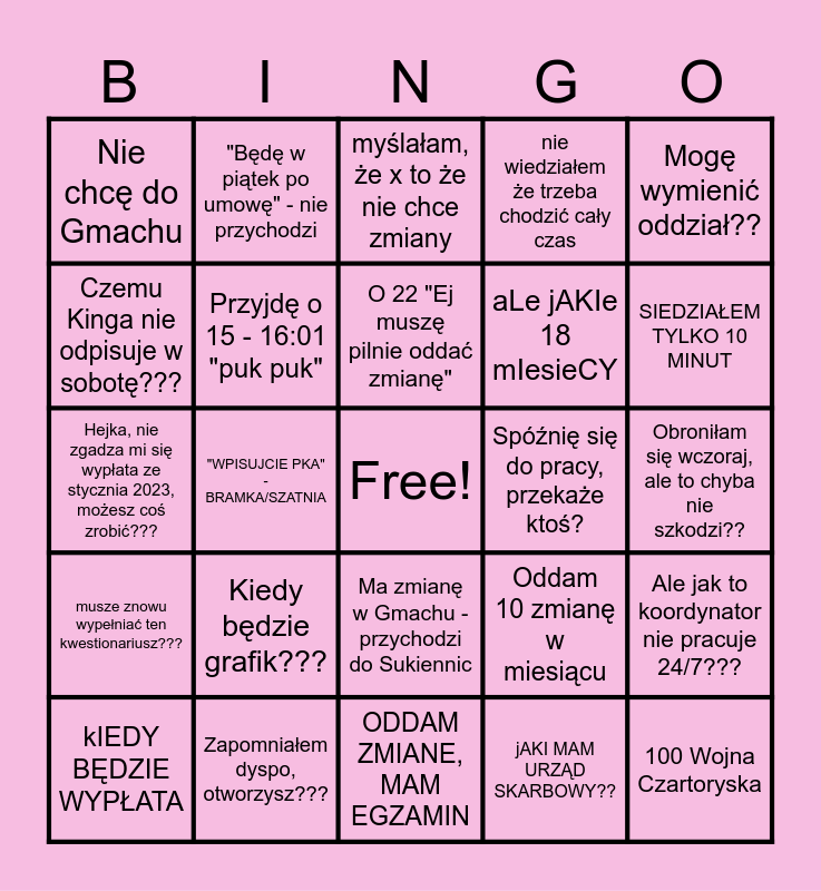 This bingo card has a free space and 24 words: Kiedy będzie grafik???, Zapomniałem dyspo, otworzysz???, O 22 "Ej muszę pilnie oddać zmianę", kIEDY BĘDZIE WYPŁATA, Mogę wymienić oddział??, Nie chcę do Gmachu, Czemu Kinga nie odpisuje w sobotę???, "Będę w piątek po umowę" - nie przychodzi, Spóźnię się do pracy, przekaże ktoś?, Ma zmianę w Gmachu - przychodzi do Sukiennic, aLe jAKIe 18 mIesieCY, Hejka, nie zgadza mi się wypłata ze stycznia 2023, możesz coś zrobić???, Oddam 10 zmianę w miesiącu, Ale jak to koordynator nie pracuje 24/7???, Przyjdę o 15 - 16:01 "puk puk", jAKI MAM URZĄD SKARBOWY??, Obroniłam się wczoraj, ale to chyba nie szkodzi??, myślałam, że x to że nie chce zmiany, SIEDZIAŁEM TYLKO 10 MINUT, "WPISUJCIE PKA" - BRAMKA/SZATNIA, 100 Wojna Czartoryska, musze znowu wypełniać ten kwestionariusz???, nie wiedziałem że trzeba chodzić cały czas and ODDAM ZMIANE, MAM EGZAMIN.