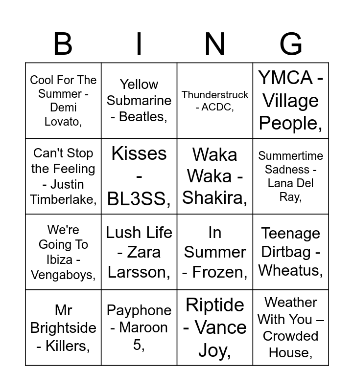 This bingo card has 87 words: Summer - Calvin Harris,, Summer Days - Martin Garrix,, Shotgun - George Ezra,, Summertime - DJ Jazzy Jeff,, In the Summertime - Mungo Jerry,, Walking on Sunshine - Katrina and the Waves,, Steal my Sunshine - Len,, Watermelon Sugar - Harry Styles,, Schools Out - Alice Cooper,, Espresso - Sabrina Carpenter,, Sun is Shining - Bob Marley,, Summer of 69 - Bryan Adams,, Summer Nights - Grease,, Riptide - Vance Joy,, Surfin USA - Beach Boys,, Summertime Sadness - Lana Del Ray,, Flowers - Miley Cyrus,, California Girls - Katy Perry,, Hot in Here - Nelly,, Cruel Summer - Taylor Swift,, Good Vibrations - Beach Boys,, Here Comes the Sun - The Beatles,, In Summer - Frozen,, Gangnam Style - PSY,, Happy - Pharrell Williams,, Uptown Funk - Bruno Mars,, Move Your Feet - Junior Senior,, Livin La Vida Loca - Ricky Martin,, Timber - Pitbull,, Ketchup Song - Las Ketchup,, Macarena - Los Del Rio,, The Only Way is Up - Yazz,, Pink Pony Club - Chappell Roan,, Lava Chicken - Jack Black,, Kisses - BL3SS,, Came Here for Love - Sigala,, Lush Life - Zara Larsson,, One Kiss - Dua Lipa,, Beautiful Day - U2,, Teenage Dirtbag - Wheatus,, Wonderwall - Oasis,, Bad Habits - Ed Sheeran,, Wrecking Ball - Miley Cyrus,, Payphone - Maroon 5,, APT - Rose + Bruno Mars,, Can't Stop the Feeling - Justin Timberlake,, Three Little Birds - Bob Marley,, Yellow Submarine - Beatles,, Wellerman - Nathan Evans,, Baby Shark - Pink Fong,, Holiday - Greenday,, I Gotta Feelin - Black Eyed Peas,, Weather With You – Crowded House,, Get Lucky – Daft Punk,, Carry You Home – Alex Warren,, I Do Like To Be Beside The Seaside – Mr Tumble,, We're Going To Ibiza - Vengaboys,, Barbie Girl - Aqua,, Blue - Eiffel 65,, YMCA - Village People,, Waka Waka - Shakira,, Cotton Eye Joe - Rednecks,, Chuchuwa - Canciones Infantiles,, Party In USA - Miley Cyrus,, Five Colours In Her Hair - McFly,, Call Me Maybe - Carly Rae Jepson,, Sweet Child 'O Mine - Guns 'N' Roses,, Old Town Road - Lil Nas X,, Mr Brightside - Killers,, All Bout The Bass - Meghan Trainor,, You Can't Stop the Beat - Hairspray,, Don't Stop Believing - Journey,, Thunderstruck - ACDC,, Dancing Queen - ABBA,, Hey Soul Sister - Train,, Dancing In The Moonlight - Toploader,, 500 Miles - Proclaimers,, Jump Around - House Of Pain,, Conga - Miami Dance Machine,, If Your Happy and You Know It - CocoMelon,, Dakota - Stereophionics,, Paradise - George Ezra,, Islands In The Stream - Dolly Parton,, Despacito - Luis Fonsi,, Juice - Lizzo,, Cool For The Summer - Demi Lovato, and Hymn For The Weekend - Coldplay,.