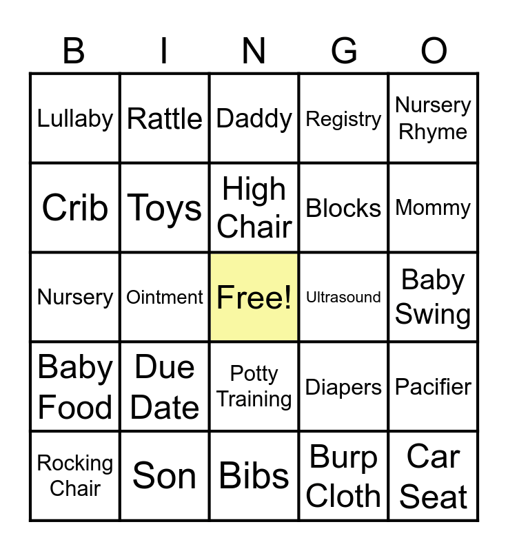 This bingo card has a free space and 24 words: Rocking Chair, Due Date, High Chair, Burp Cloth, Nursery Rhyme, Lullaby, Rattle, Daddy, Ultrasound, Baby Swing, Nursery, Toys, Diapers, Pacifier, Crib, Son, Bibs, Registry, Mommy, Baby Food, Ointment, Potty Training, Blocks and Car Seat.