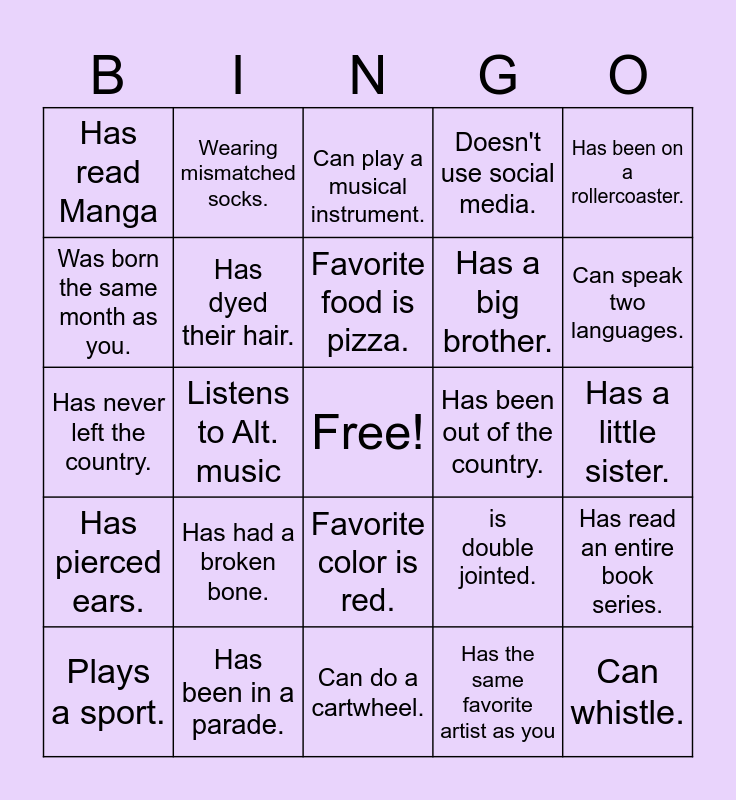 This bingo card has a free space and 24 words: Has had a broken bone., Has been in a parade., Favorite food is pizza., Plays a sport., Has been on a rollercoaster., Has read Manga, Was born the same month as you., Wearing mismatched socks., Has been out of the country., Favorite color is red., Has a big brother., Has never left the country., is double jointed., Has read an entire book series., Has dyed their hair., Has the same favorite artist as you, Has a little sister., Can play a musical instrument., Can speak two languages., Listens to Alt. music, Can whistle., Has pierced ears., Doesn't use social media. and Can do a cartwheel..