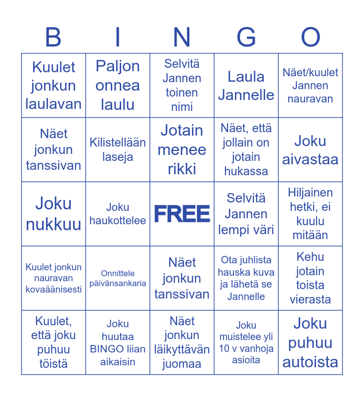 This bingo card has a free space and 24 words: Kuulet, että joku puhuu töistä, Onnittele päivänsankaria, Jotain menee rikki, Joku muistelee yli 10 v vanhoja asioita, Näet/kuulet Jannen nauravan, Kuulet jonkun laulavan, Paljon onnea laulu, Selvitä Jannen toinen nimi, Selvitä Jannen lempi väri, Hiljainen hetki, ei kuulu mitään, Joku nukkuu, Kilistellään laseja, Ota juhlista hauska kuva ja lähetä se Jannelle, Kehu jotain toista vierasta, Näet jonkun tanssivan, Joku huutaa BINGO liian aikaisin, Näet jonkun läikyttävän juomaa, Laula Jannelle, Joku aivastaa, Kuulet jonkun nauravan kovaäänisesti, Joku haukottelee, Näet jonkun tanssivan, Näet, että jollain on jotain hukassa and Joku puhuu autoista.