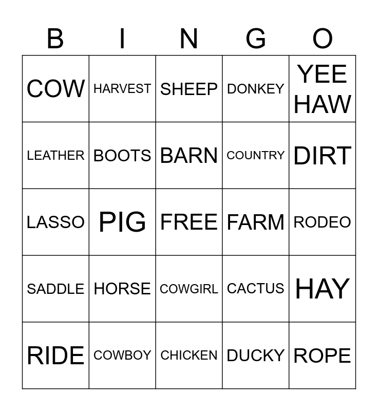 This bingo card has a free space and 24 words: HORSE, COWBOY, BARN, RIDE, YEE HAW, COW, LEATHER, HARVEST, FARM, COWGIRL, COUNTRY, LASSO, CACTUS, HAY, BOOTS, DUCKY, RODEO, SHEEP, DIRT, PIG, ROPE, SADDLE, DONKEY and CHICKEN.