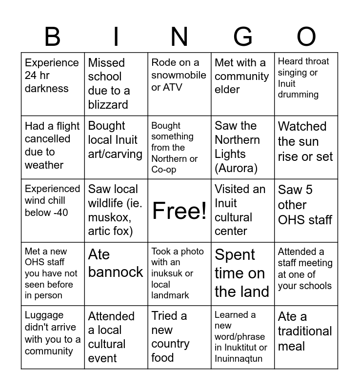 This bingo card has a free space and 24 words: Ate bannock, Attended a local cultural event, Bought something from the Northern or Co-op, Luggage didn't arrive with you to a community, Heard throat singing or Inuit drumming, Experience 24 hr darkness, Had a flight cancelled due to weather, Missed school due to a blizzard, Visited an Inuit cultural center, Took a photo with an inuksuk or local landmark, Saw the Northern Lights (Aurora), Experienced wind chill below -40, Spent time on the land, Attended a staff meeting at one of your schools, Bought local Inuit art/carving, Learned a new word/phrase in Inuktitut or Inuinnaqtun, Saw 5 other OHS staff, Rode on a snowmobile or ATV, Watched the sun rise or set, Saw local wildlife (ie. muskox, artic fox), Ate a traditional meal, Met a new OHS staff you have not seen before in person, Met with a community elder and Tried a new country food.