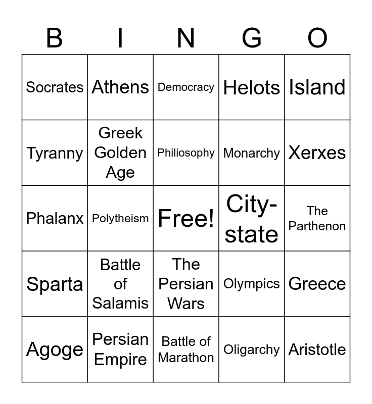 This bingo card has a free space and 28 words: Greece, Aegean Sea, Monarchy, Oligarchy, Tyranny, Democracy, Athens, Sparta, City-state, Agoge, Phalanx, Helots, Persian Empire, Battle of Marathon, Xerxes, Battle of Thermopylae, Battle of Salamis, Greek Golden Age, Philiosophy, The Persian Wars, Socrates, Plato, Aristotle, Polytheism, The Parthenon, Olympics, Island and Peninsula.