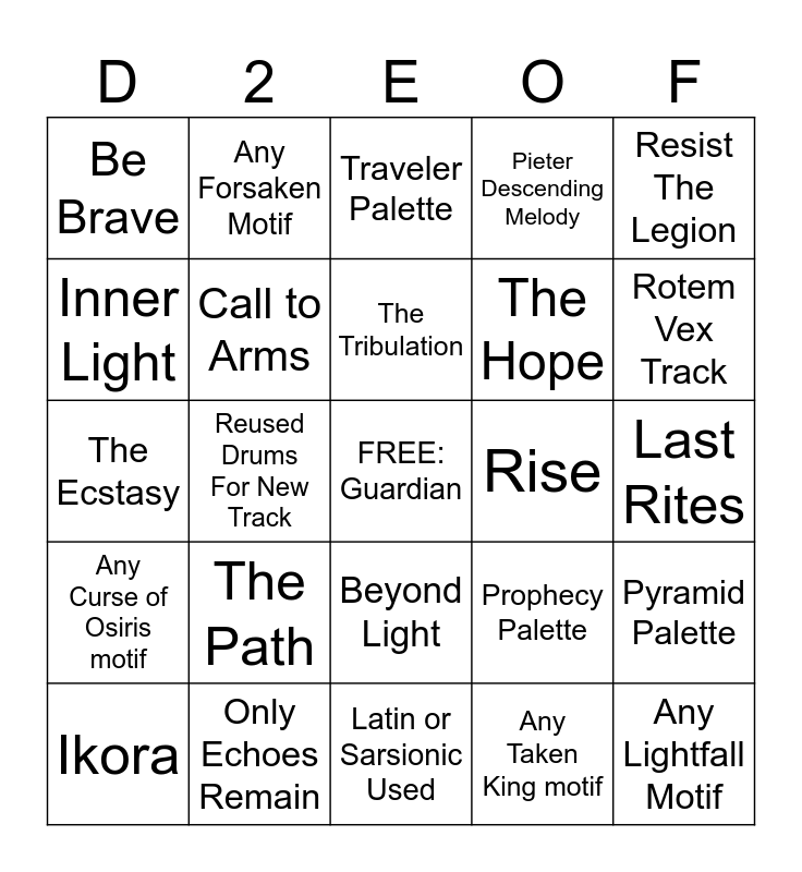 This bingo card has a free space and 24 words: The Path, Only Echoes Remain, The Tribulation, Ikora, Resist The Legion, Be Brave, Inner Light, Any Forsaken Motif, Rise, Beyond Light, The Hope, The Ecstasy, Prophecy Palette, Pyramid Palette, Call to Arms, Any Taken King motif, Last Rites, Traveler Palette, Rotem Vex Track, Reused Drums For New Track, Any Lightfall Motif, Any Curse of Osiris motif, Pieter Descending Melody and Latin or Sarsionic Used.