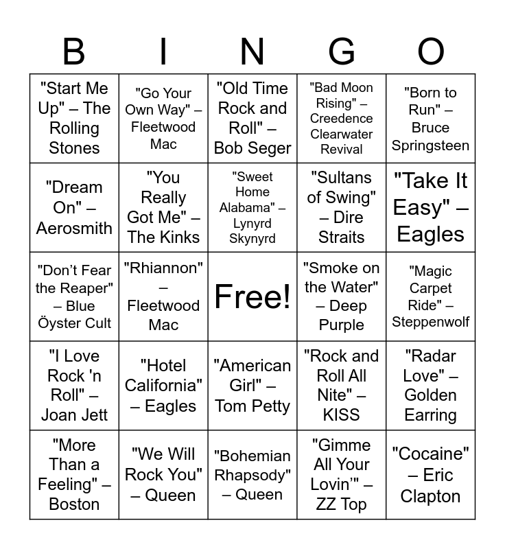This bingo card has a free space and 25 words: "Hotel California" – Eagles, "Bohemian Rhapsody" – Queen, "Sweet Home Alabama" – Lynyrd Skynyrd, "More Than a Feeling" – Boston, "Born to Run" – Bruce Springsteen, "Start Me Up" – The Rolling Stones, "Dream On" – Aerosmith, "Go Your Own Way" – Fleetwood Mac, "Smoke on the Water" – Deep Purple, "American Girl" – Tom Petty, "Sultans of Swing" – Dire Straits, "Don’t Fear the Reaper" – Blue Öyster Cult, "Rock and Roll All Nite" – KISS, "Radar Love" – Golden Earring, "You Really Got Me" – The Kinks, "Black Dog" – Led Zeppelin, "Magic Carpet Ride" – Steppenwolf, "Old Time Rock and Roll" – Bob Seger, "Take It Easy" – Eagles, "Rhiannon" – Fleetwood Mac, "Cocaine" – Eric Clapton, "We Will Rock You" – Queen, "I Love Rock 'n Roll" – Joan Jett, "Bad Moon Rising" – Creedence Clearwater Revival and "Gimme All Your Lovin’" – ZZ Top.