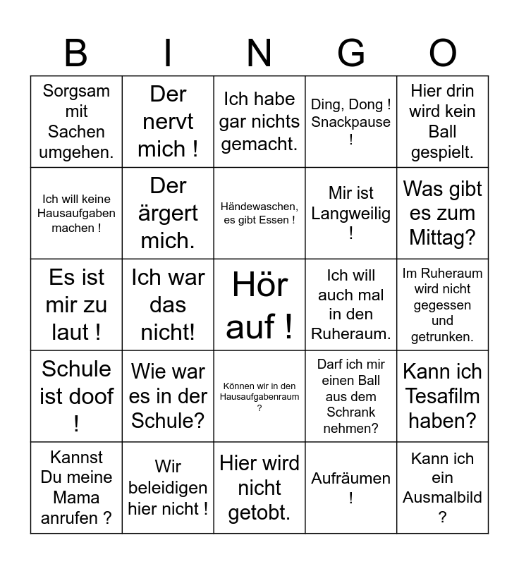 This bingo card has 30 words: Wir beleidigen hier nicht !, Spielst Du etwas mit mir?, Ich war das nicht!, Klärt das unter euch!, Sorgsam mit Sachen umgehen., Ich habe gar nichts gemacht., Der ärgert mich., Können wir in den Hausaufgabenraum ?, Ich will auch mal in den Ruheraum., Hier wird nicht getobt., Im Ruheraum wird nicht gegessen und getrunken., Hör auf !, Aufräumen !, Kann ich ein Ausmalbild ?, Was gibt es zum Mittag?, Wann frühstücken wir ?, Darf ich mir einen Ball aus dem Schrank nehmen?, Schule ist doof !, Wie war es in der Schule?, Hier drin wird kein Ball gespielt., Es ist mir zu laut !, Wann werde ich abgeholt?, Der nervt mich !, Mir ist Langweilig !, Ich will keine Hausaufgaben machen !, Ding, Dong ! Snackpause !, Kann ich Tesafilm haben?, Kannst Du meine Mama anrufen ?, Händewaschen, es gibt Essen ! and Das Essen schmeckt nicht..