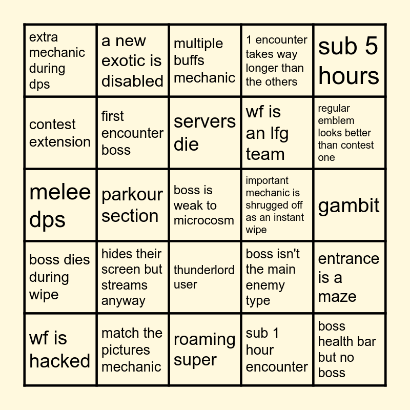 This bingo card has 25 words: hides their screen but streams anyway, roaming super, servers die, wf is hacked, sub 5 hours, extra mechanic during dps, contest extension, a new exotic is disabled, important mechanic is shrugged off as an instant wipe, thunderlord user, wf is an lfg team, melee dps, boss isn't the main enemy type, entrance is a maze, first encounter boss, boss health bar but no boss, gambit, multiple buffs mechanic, regular emblem looks better than contest one, parkour section, boss is weak to microcosm, match the pictures mechanic, boss dies during wipe, 1 encounter takes way longer than the others and sub 1 hour encounter.