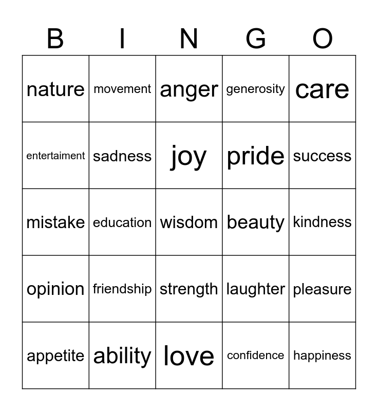 This bingo card has 25 words: friendship, love, joy, appetite, care, nature, entertaiment, movement, beauty, strength, pride, mistake, laughter, pleasure, sadness, happiness, kindness, anger, success, education, wisdom, ability, opinion, generosity and confidence.
