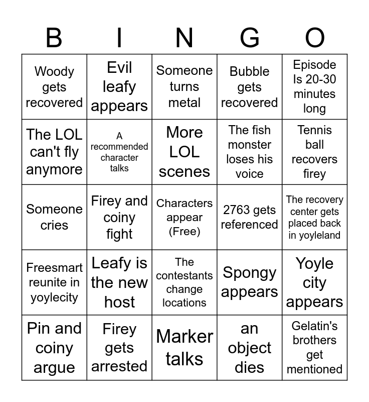 This bingo card has a free space and 24 words: Leafy is the new host, Firey gets arrested, More LOL scenes, Pin and coiny argue, Episode Is 20-30 minutes long, Woody gets recovered, The LOL can't fly anymore, Evil leafy appears, 2763 gets referenced, The contestants change locations, The fish monster loses his voice, Someone cries, Spongy appears, Yoyle city appears, A recommended character talks, an object dies, The recovery center gets placed back in yoyleland, Someone turns metal, Tennis ball recovers firey, Firey and coiny fight, Gelatin's brothers get mentioned, Freesmart reunite in yoylecity, Bubble gets recovered and Marker talks.